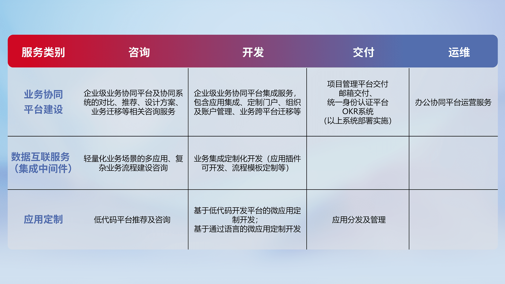 针对钉钉、、、、企微、、、、IDaas等平台级产品提供产品的规划、、、、方案、、交付、、定制化开发等服务,,实现如统一协同办公、、、、智能客户服务、、、、混合会议管理、、智能数据查询、、等业务场景,,,实现数字化转型。。。